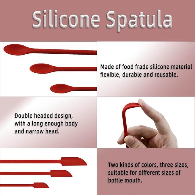 • →Double heads Soft Tips: The scraper is flexible, the tip front is flexible and elastic, the spatulas and the mini spoons can get every drop in your bottle.